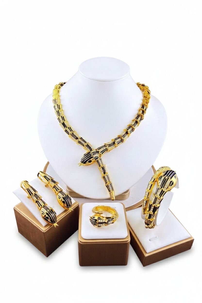 Asaleti ve şıklığı bir arada sunan, yılan figürlü bu komple takı seti (kolye, bilezik, küpe, yüzük) ile vitrinlerinizi canlandırın. Son trendlere uygun, yüksek talep görecek bir üründür.