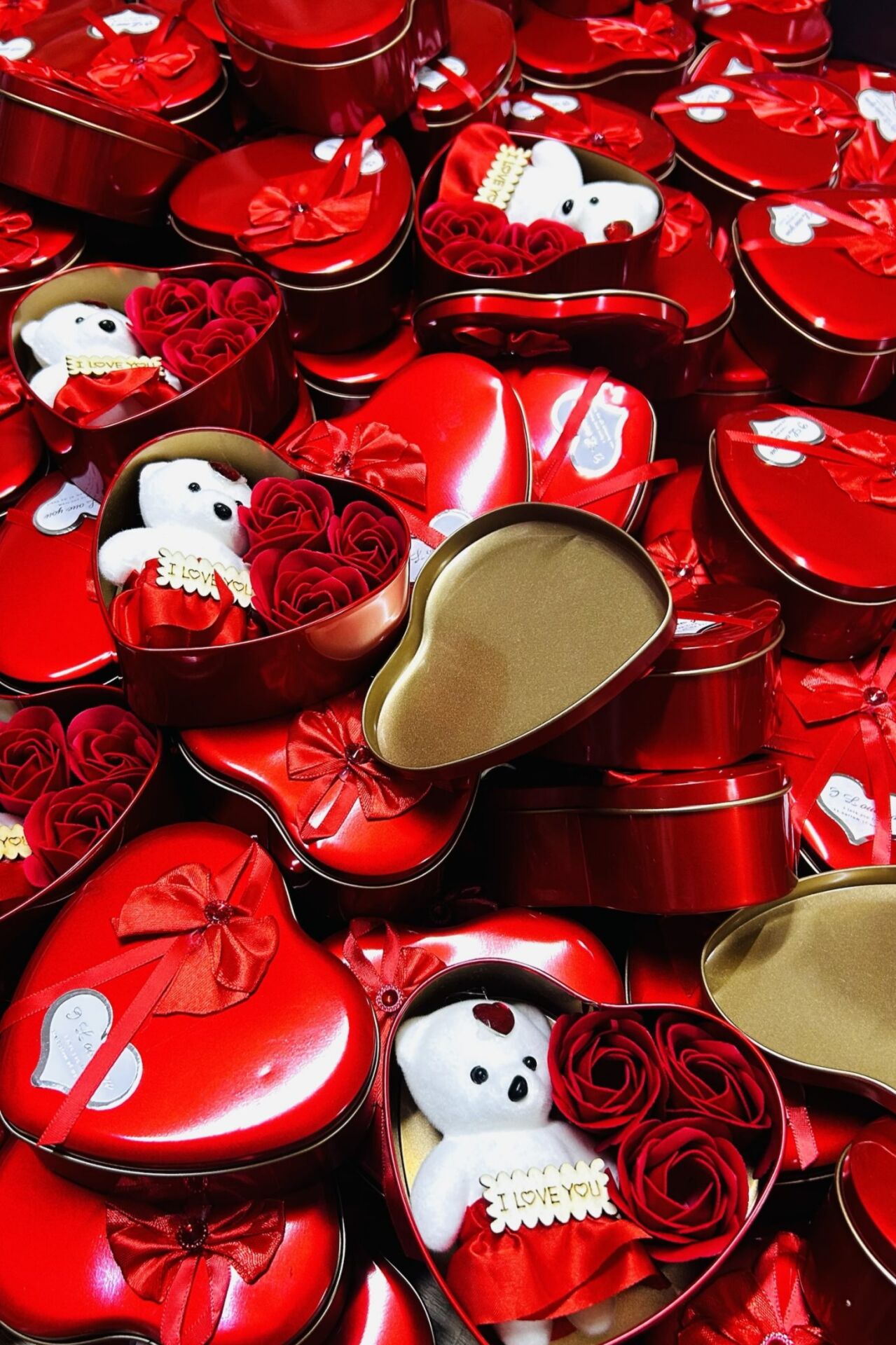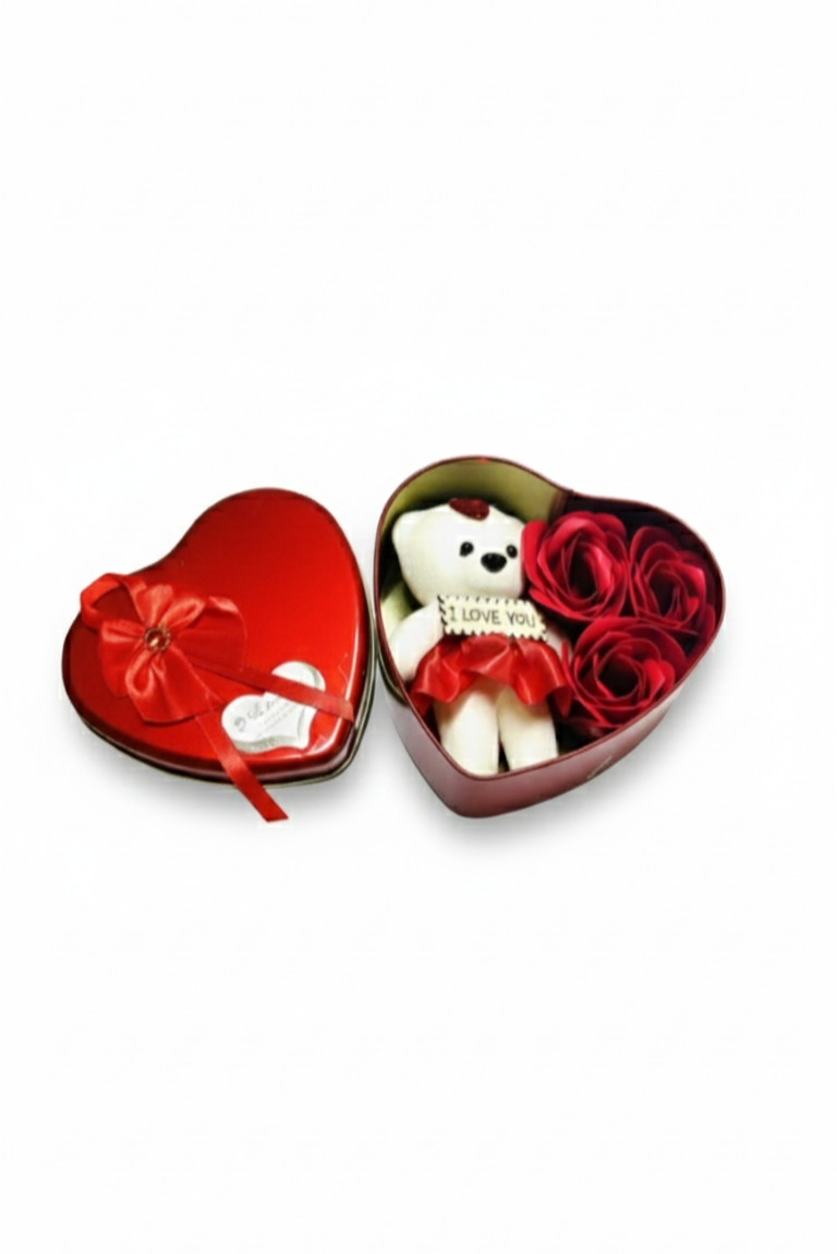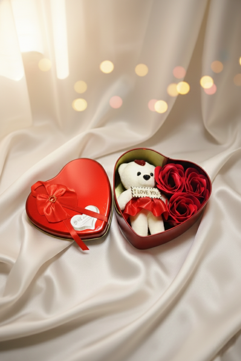 Romantik Metal Kalp Kutuda Ayıcık ve Yapay Güller