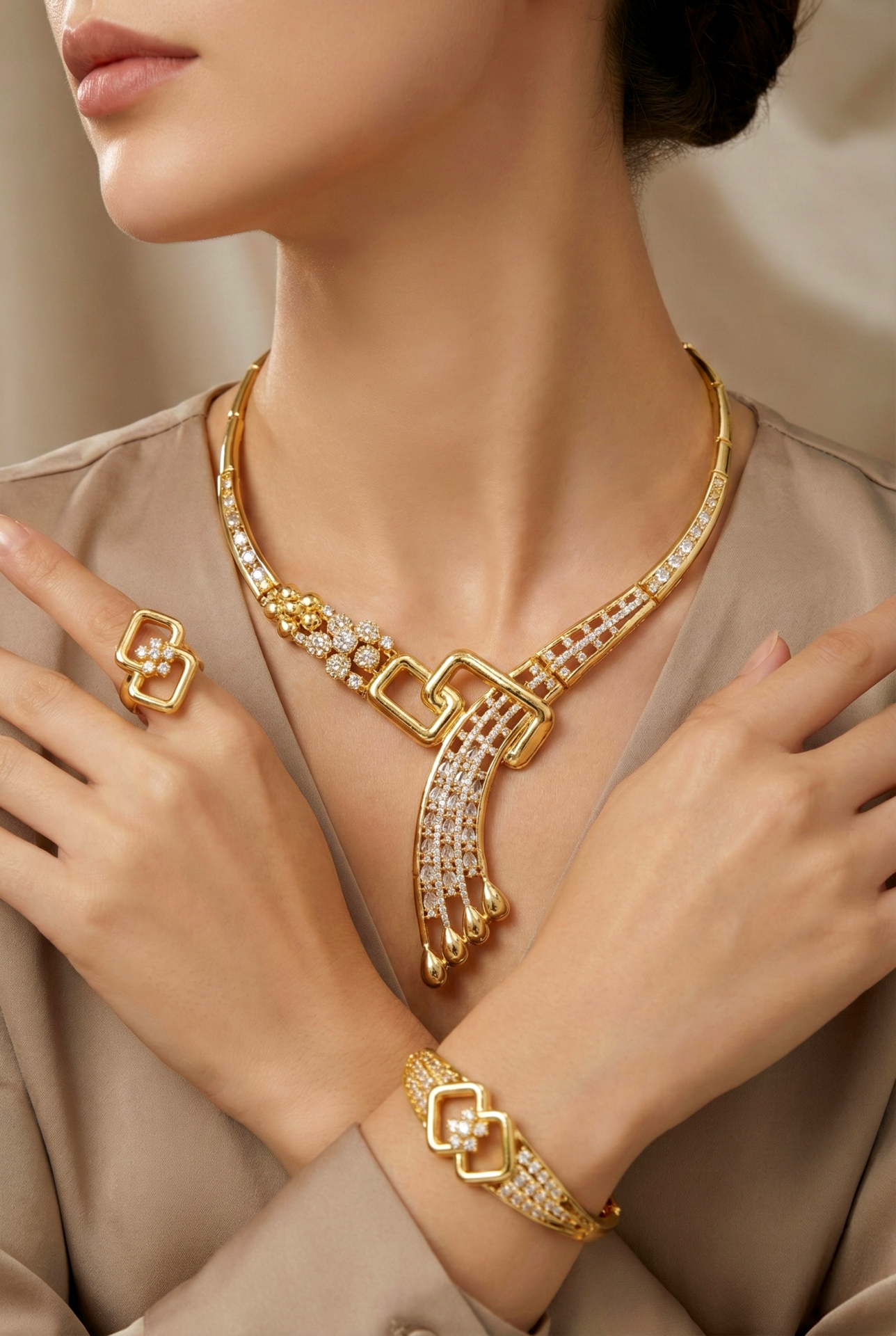 Mağazanızın en göz alıcı parçası olmaya aday! Özel tasarımı ve birinci sınıf işçiliği ile dikkat çeken bu 3'lü takı seti, müşterilerinize sunabileceğiniz en prestijli modellerden biridir. Modern geometrik detayların, yoğun zirkon taş işlemeleriyle buluştuğu bu set, özel davetler ve düğün sezonu için ideal bir tercihtir.